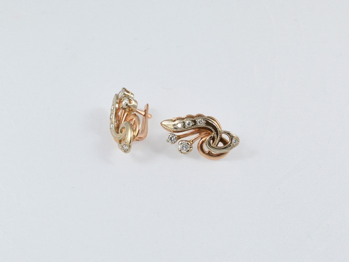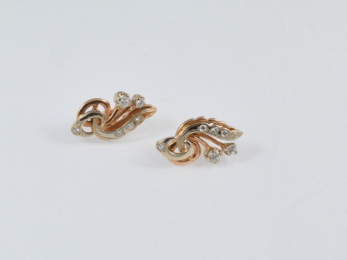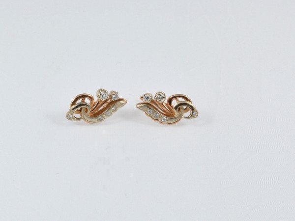 Kolczyki złote w próbie 0,585, o masie 6,67 g. W oprawach z białego złota umieszczono 12 diamentów o szlifie brylantowym, masie łącznej ok. 0,56 ct, barwie H, czystości SI.